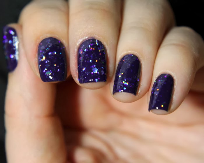 В первых строках своего поста хочу сказать, что этот лак мне не понравился. Неправильно, конечно, начинать с плохого, но куда деваться. Deborah Lippmann Va Va Voom - крупный шестиугольный и мелкий круглый голографический глиттер в сине-фиолетовой желейной базе. Самостоятельно красить не решилась, нанесла на Essie No More Film - сине-фиолетовый крем, идентичный по оттенку основе ДЛ. Глиттера на кисть набирается много, распределяется довольно хорошо, но густоват. Высыхает страшным матовым месивом, два слоя топа немного исправили ситуацию, но не настолько, чтобы мне понравилось то, что получилось - слишком грубо.