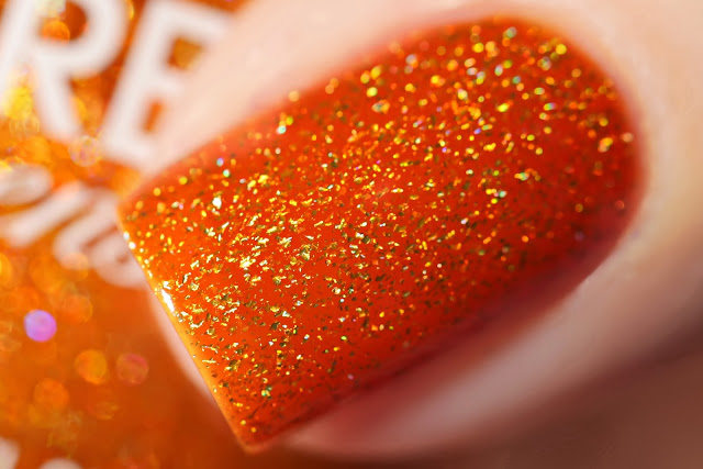 And All I Loved, I Loved Alone is an orange jelly with holo microflakies. My favourite one, i've been wearing it for three days and it chipped just on one nail by the end and no staining at all. Below two coats and no top coat.