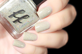 Bare Embellishment is a greyish beige base with holo particles, platinum flakes and holo microglitters. Below three coats plus top coat.