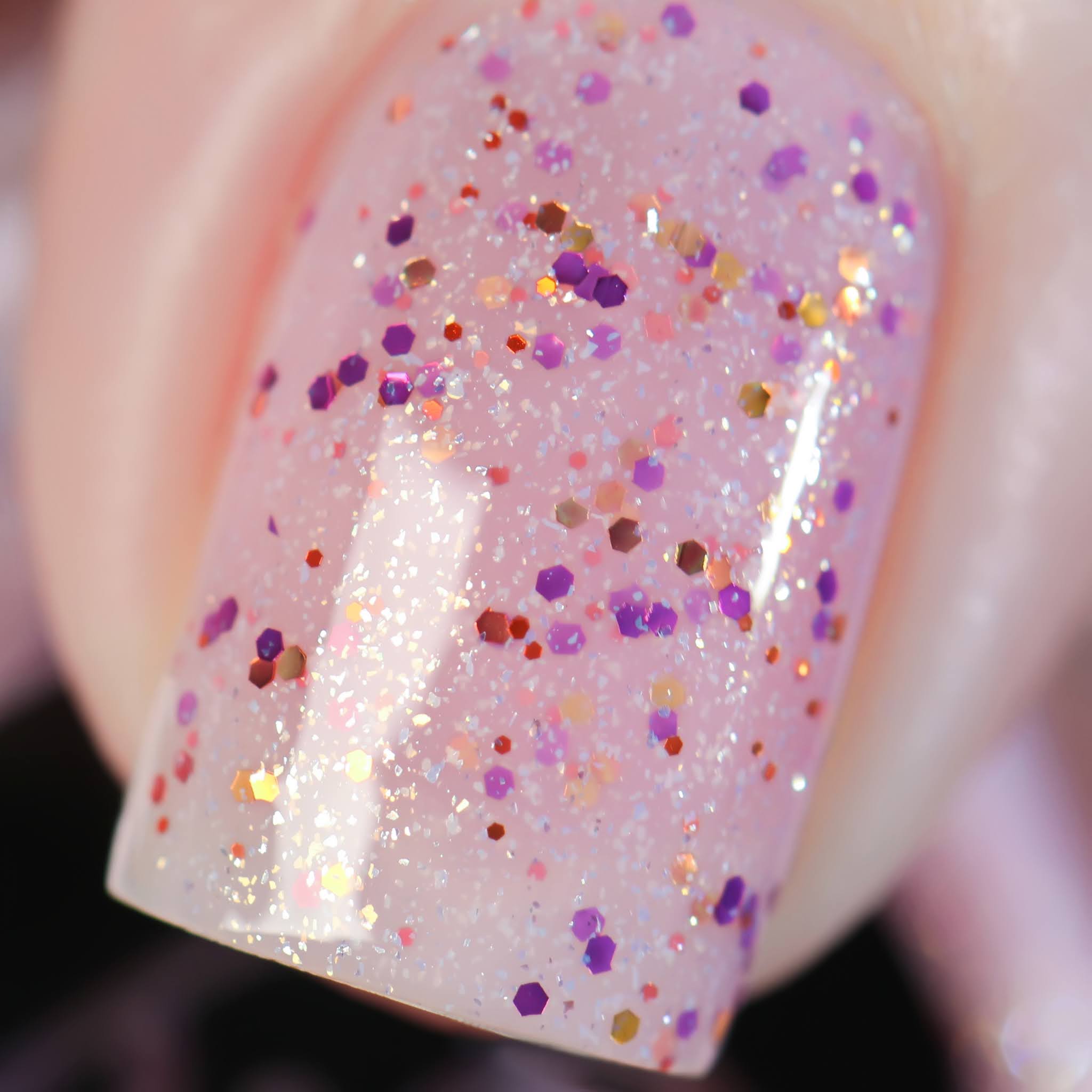 Palm Reader is a lilac jelly with pink and gold shimmer and purple, blue and gold microglitters. Below three coats plus top coat.