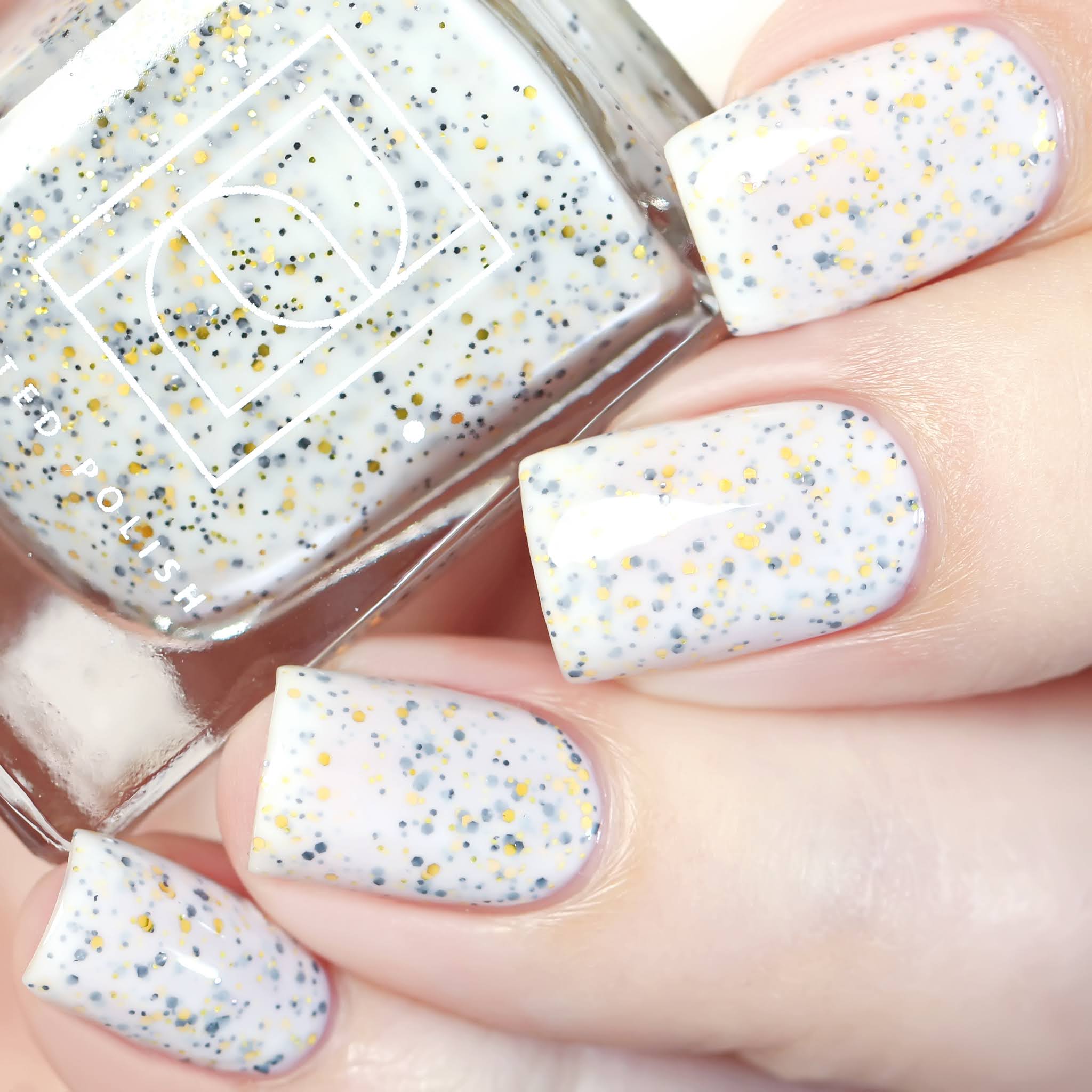 Catch You Crater is a white crelly with gold and gunmetal grey glitters. Below two coats plus top coat.