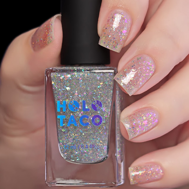 Everything Taco is a clear base with iridescent flakes and holo microflakes. Below two coats plus top coat.