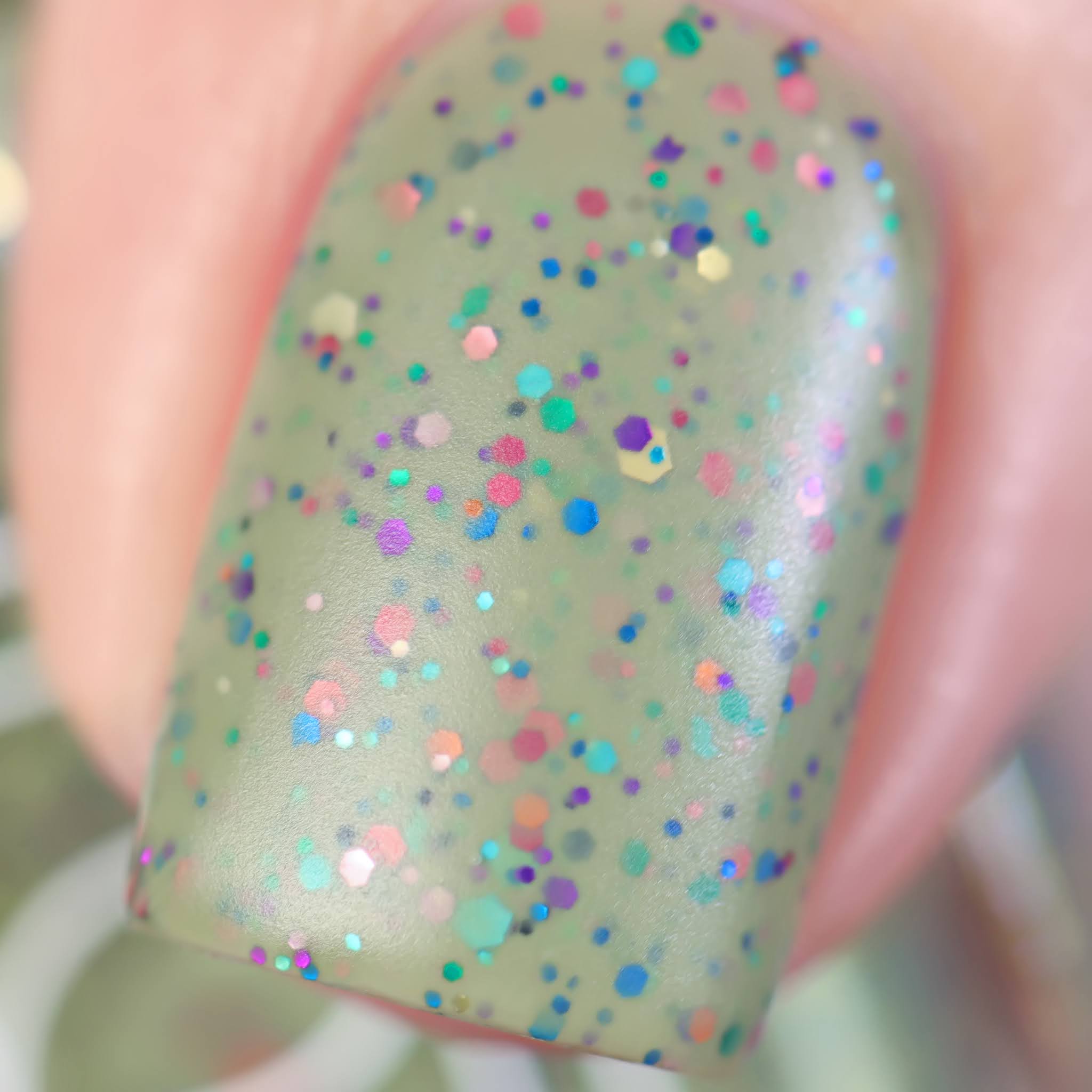 Retro Rainbow is an asparagus green crelly with a rainbow of metallic and holo glitters. Below two coats plus top coat.
