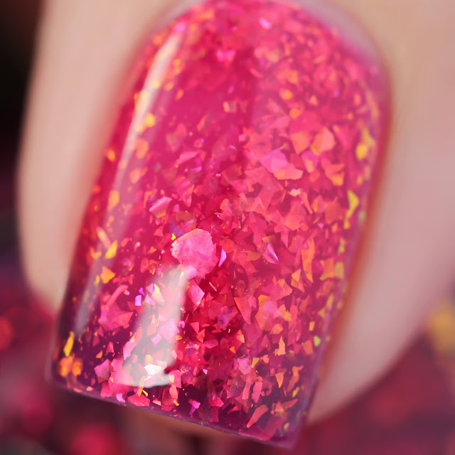 Femme Fatale Baking Flirty Heart Cookies is a magenta when warm and purple when cold thermal nail polish with pink to red to green to gold shifting flakes. Below three coats plus top coat. Cap 270 bottles.